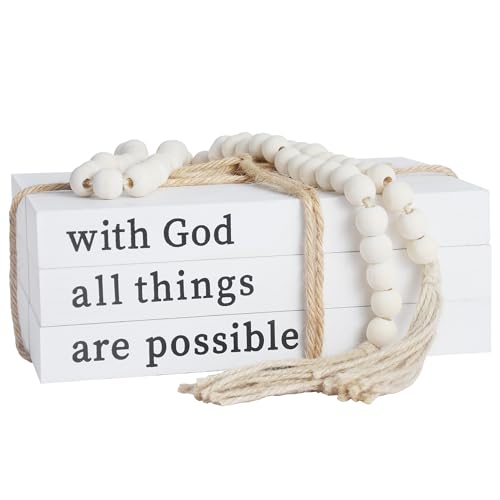What I received:Will receive decorative books for home decor that say (with God, all things, are possible)which can bring good luck to people.in addition, the set includes 1 piece of twine and 1 strand of wooden beads with tassels, You can apply these books individually or as a whole to decorate your house, such as tying them together with the matching rope as modern stacked decorations on a table or shelf, a great combination to create an unforgettable and stylish bookshelf decor