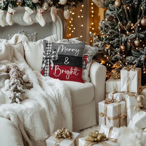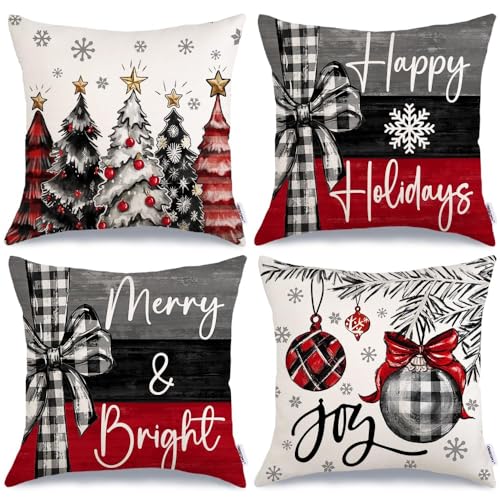 GEEORY Christmas Throw Pillow Covers 18 x 18 Inch Set of 4, Xmas Trees Merry and Bright Happy Holidays Farmhouse Decorative Cushion Cases for Home Decoration G418N-18