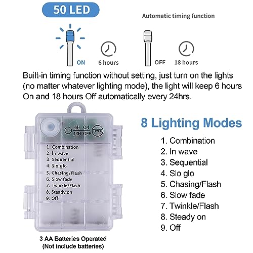 8 Lighting Modes & Timer Function: Our Christmas tree has 8 lighting modes for you to choose – Combination, In waves, Sequential, Slow Glow, Chasing/Flash, Slow fade, Twinkle/Flash, Steady on. Adjust the lighting modes by pressing the round button on the waterproof case. Built-in timing function, Just turn ON the lights(any lighting mode), it will keep 6 hours On and 18 hours Off auto every 24hrs