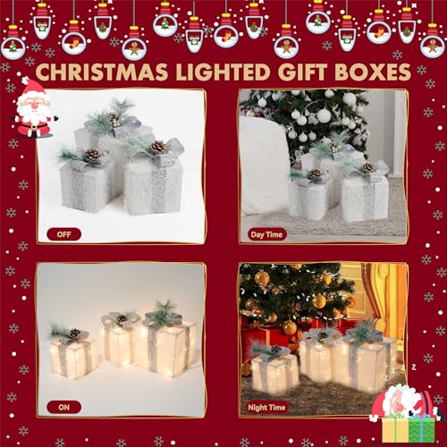 Specification: Set of 3 Christmas Lighted Gift Boxes Plug-in 60 Led Light Up Boxes Ornaments for Christmas Decorations Indoor Outdoor Home Yard Xmas Tree Holiday Party Lawn Porch (Silver)